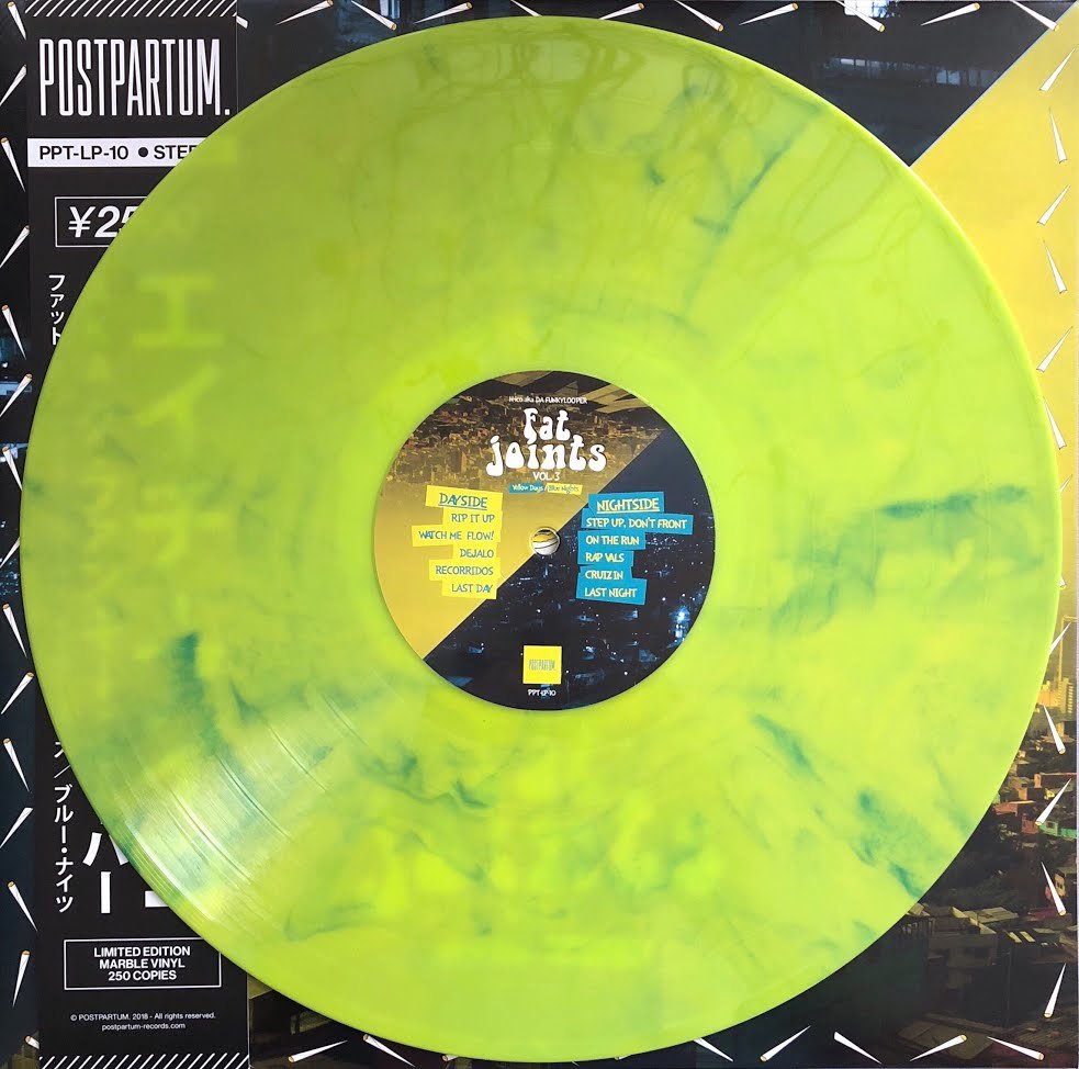 Das neueste Album vom Label POSTPARTUM. nennt sich H-ico aka DA FUNKYLOOPER – Fat Joints Volume 3 (Yellow Days / Blue Nights) und ist erneut ein optisches und akustisches Higlight für fast jede Schallplattensammlung geworden. Es ist nach Boombap Language das zweite Vinyl des kolumbianischen Beat Smith und das erste in meiner Sammlung. Von Fat Joints Volume 3 (PPT-LP-10) wurden 250 Kopien als Marble Edition (yellow/blue vinyl) und 150 Kopien als Black Edition gepresst. Beide Versionen haben es ins Vinyl-41-HQ geschafft. Die Marble Edition bleibt auch hier und die Black Edition könnt ihr weiter unten gewinnen. BTW: Wer nicht auf das Gewinnspiel hoffen will, der kann (noch) beide Versionen im Online-Shop von POSTPARTUM. Records käuflich erwerben.