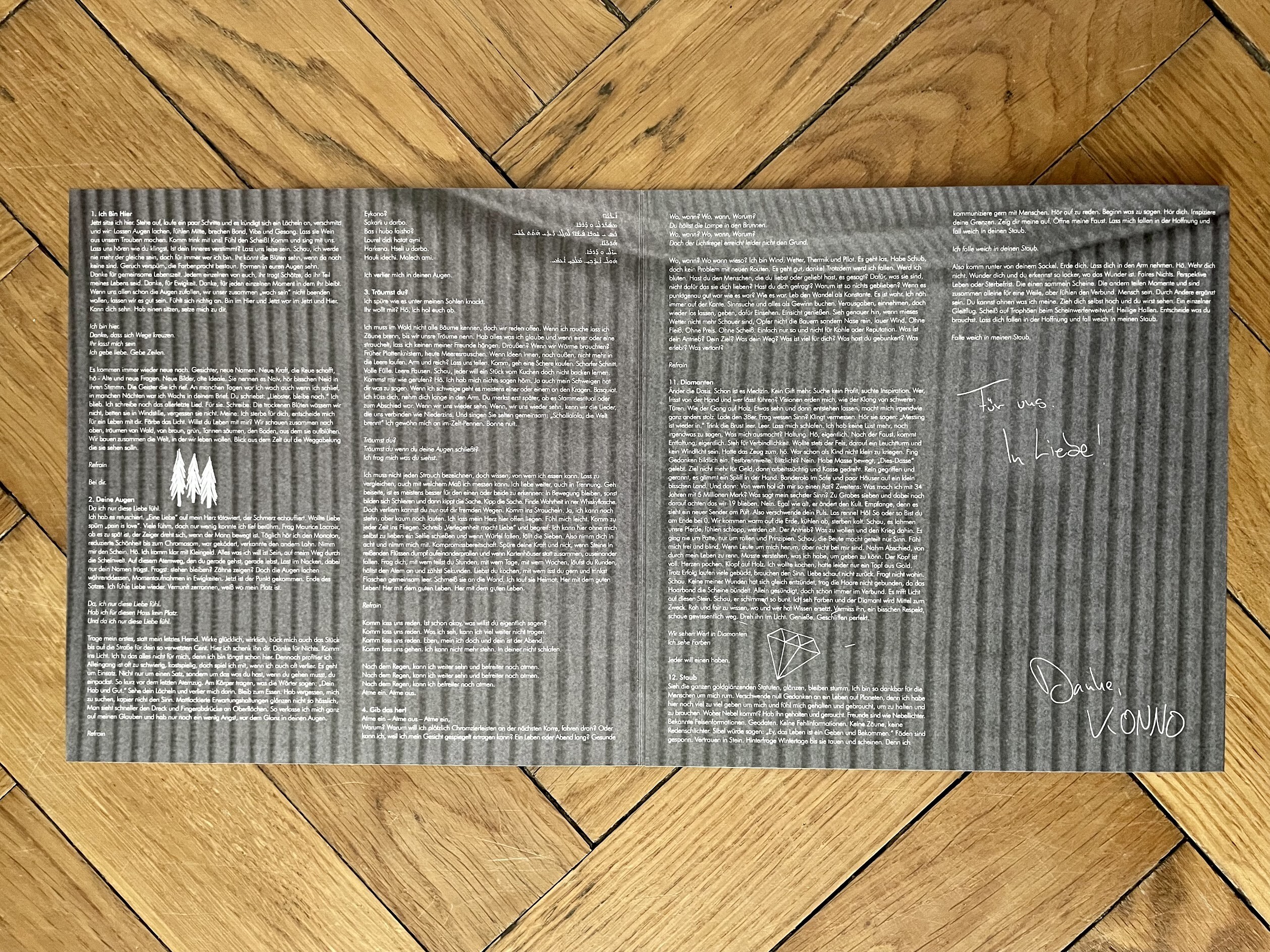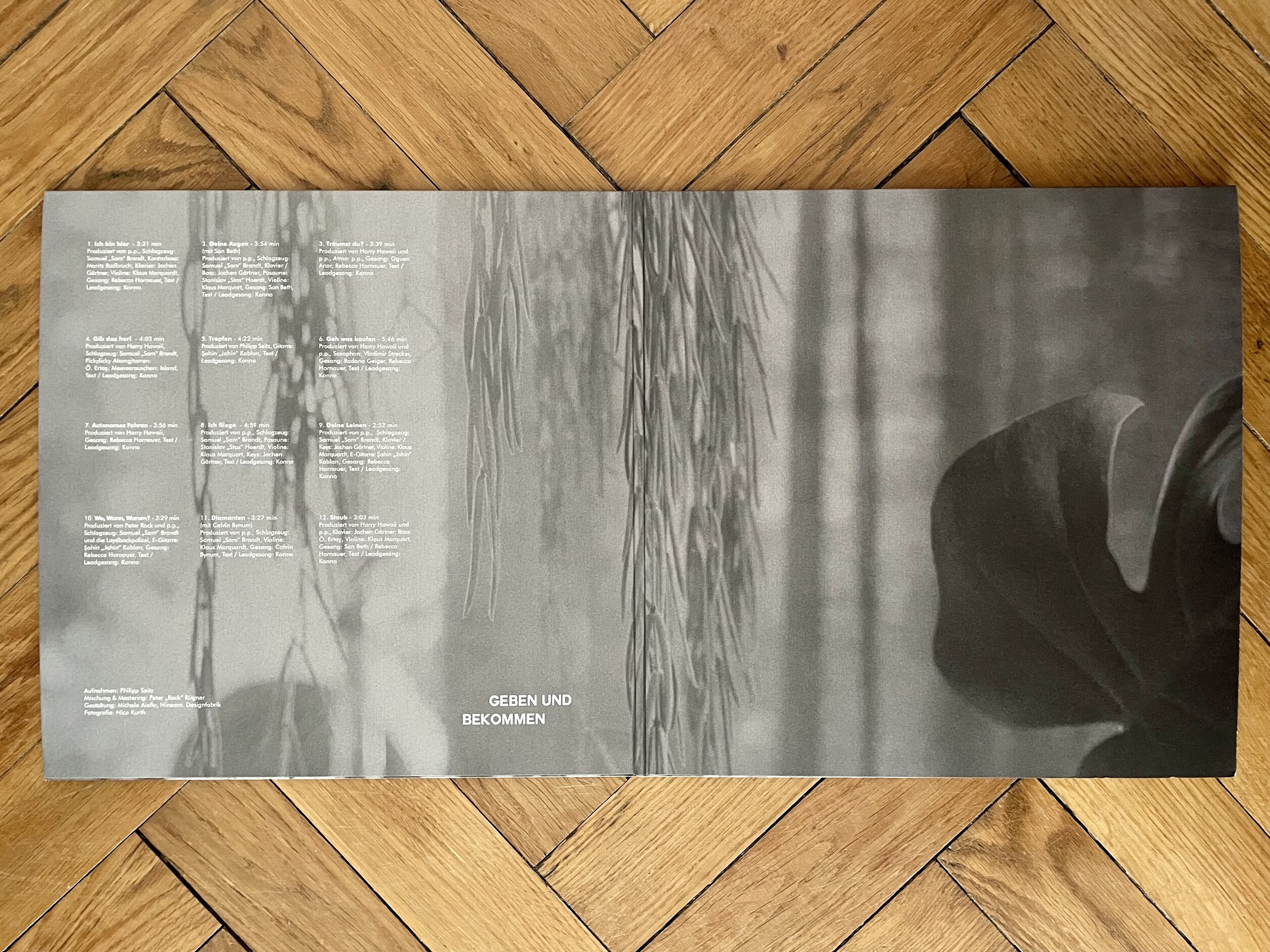 Doppeltes Debüt: Heilbronn und KONNO. „Geben und Bekommen“ nennt sich der Erstling, den mir der Künstler himself als Vinyl zur Verfügung gestellt hat. Die Platte wird von einem hübschen Gatefold Cover – gestaltet von der nineam. designfabrik – gut geschützt. Anbei gibt es noch ein kleines Booklet mit allen Texten zum lockeren Nachlesen. Visuell ist das Ding schon mal richtig gut unterwegs.
