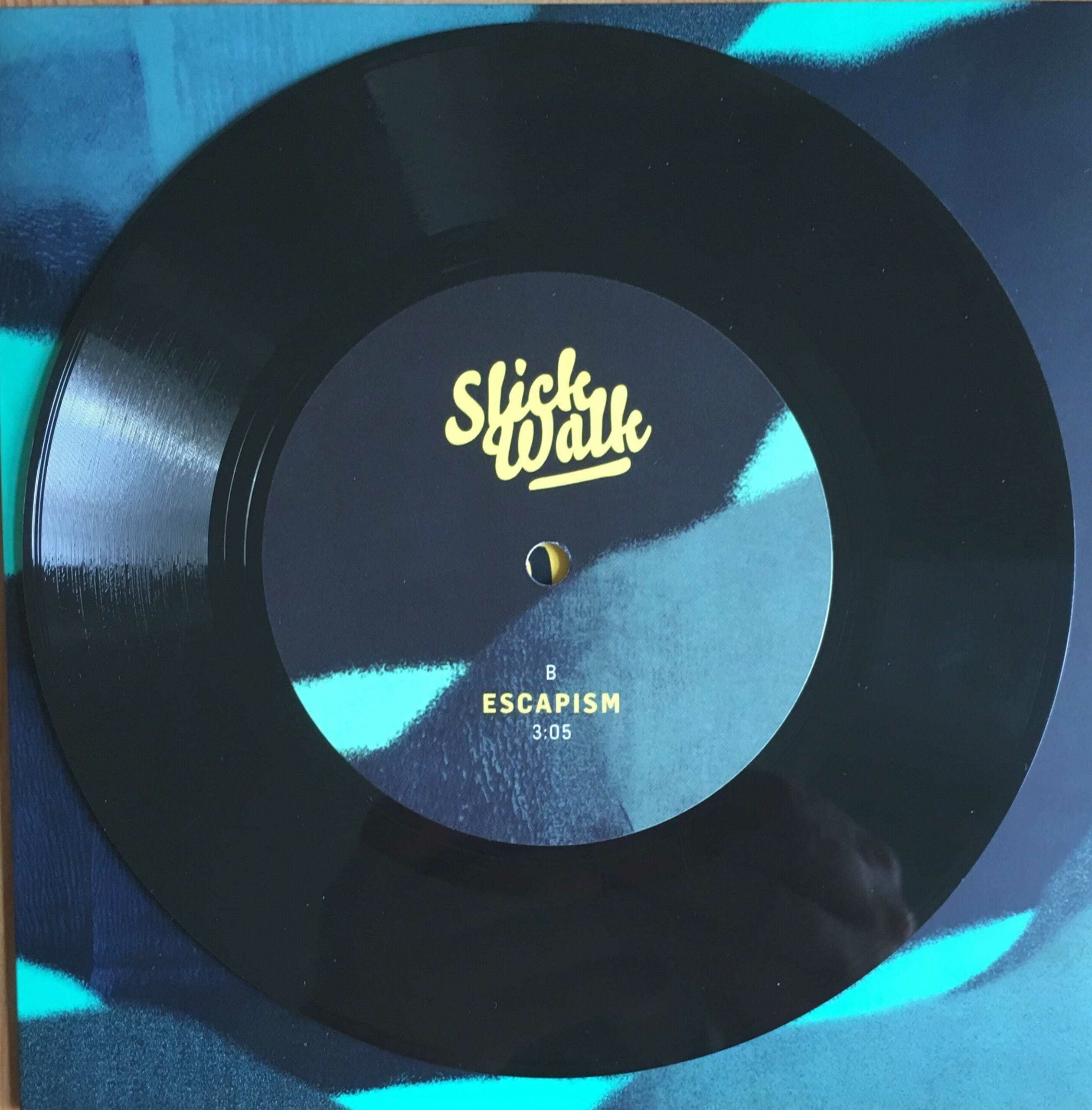 Das Artwork für die Platten hat Selina Bauer übernommen. Die 7″ Single bietet ein sehr schlichtes Design, bei dem einem der gelbe Slick-Walk-Schriftzug förmlich ins Gesicht springt. Auf der Rückseite des Covers sind die üblichen Infos über Tracks, Copyright und co. zu finden. Das Design des Covers setzt sich auf den Vinyl-Seiten A und B fort. Noch viel schlichter ist das Cover der 5″ Single, komplett in weiss und mit einem gelben Sticker versehen. Das Highlight ist das knuffige 5″ Vinyl. Traut man sich kaum aus dem Sleeve zu nehmen. Erinnert mich irgendwie an das ostzonale JUNIORFON.