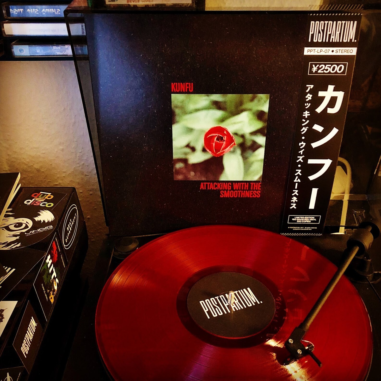 Another Beauty from POSTPARTUM. Diese Phrase kann auch bald für das Label aus Edelsfeld als Standardsatz zum Einsatz kommen. Kunfu – Attacking With The Smoothness, dass im Vinyl 41 HQ auch schon als Kassette (Digging Around The Minds Flava / DATMF021) vorliegt, ist wieder richtig hübsch geworden: Red/transparent Vinyl, OBI Strip und ganz starkes Design von TMA_One und Felix Plien. Von der Red Edition (PPT-LP-07-R) wurden 250 Kopien und von der Black Edition (PPT-LP-07-B) 150 Kopien gepresst. Von beiden Versionen sind nur noch wenige Exemplare übrig. Ab zu postpartum-records.com und auf „Add to cart“ klicken. Es lohnt sich, mal wieder!